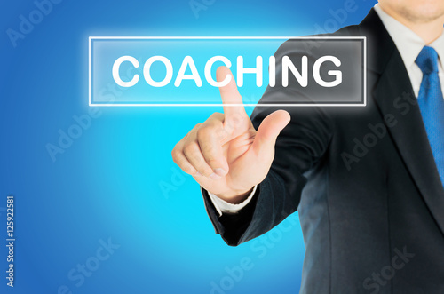 Business man is pushing COACHING transparent button word over blue gradient background, business concept