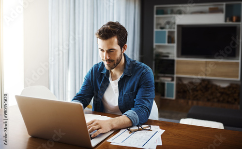 Business man, laptop and documents for remote work, research and financial planning in home office. Project management, technology and paperwork in house for budget proposal, progress report and kpi