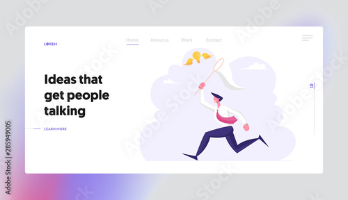 Business Man Searching Inspiration Creative Idea Website Landing Page. Businessman Chasing Flying Light Bulb Trying to Catch it with Butterfly Net Web Page Banner. Cartoon Flat Vector Illustration