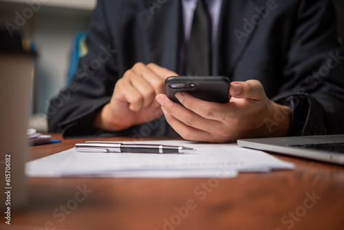 Business man using mobile smart phone management information financial documents, marketing online, job and payment digital technology on desk.