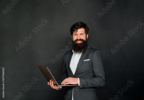 Business man with PC. Smiling bearded man with laptop. Handsome businessman working with notebook. Office, business, technology, internet. Man with laptop computer in hand. Confident business expert.