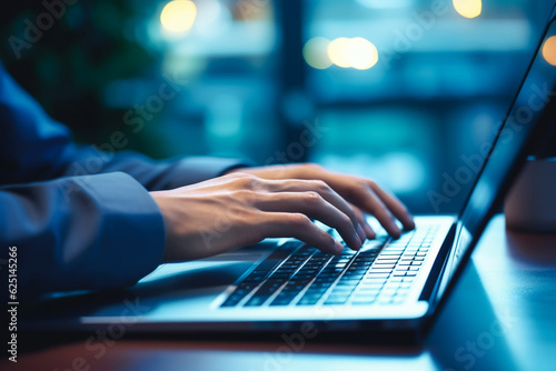business man working about finance report on digital laptop computer on desk in office at night, business technology, investment, digital online marketing and financial business concept, Generative AI