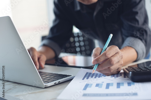 Business man working at office with laptop computer and digital tablet and financial report graph data documents on his desk, close up