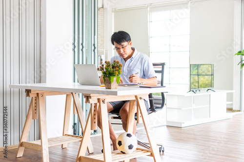 business man working from home in front of laptop on desk and wearing casual outfit.