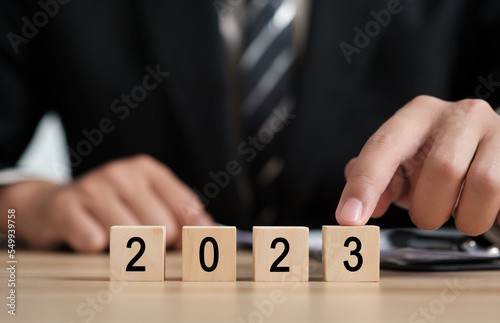Business management and financial concept. 2023 goal and target. Hand pick dartboards with 2023 number for set strategy and plan for future.