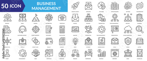 Business Management icon collection set. Containing Rocket Launch, Envelope, Pie Chart ,Office Building, Settings, Conversation, Process, Wage, Mission, Distribution icon