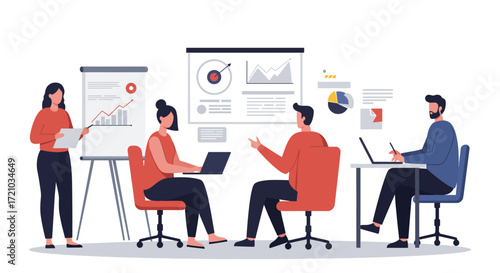 Business meeting analyzing data graphs team collaboration in office discussing strategy for corporate presentation showcasing teamwork effectiveness.