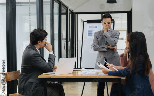 Business Meeting Challenge: A serious business meeting unfolds, with team members deeply engrossed in a challenging discussion, their focused expressions reflecting the gravity of the situation.