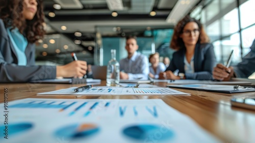 Business Meeting in Modern Office with Focus on Financial Reports and Charts on Table