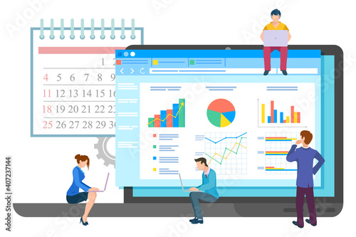 Business meeting or working process. Office workers standing and sitting near big screen with laptops. Business people man and woman talking communication, discuss presentation graph and chart