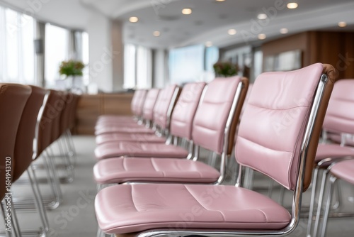 Business meeting setup modern conference room with pink chairs professional environment focused perspective
