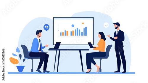 Business Meeting with Data Visualization and Analysis in Modern Office Environment Featuring Professionals Engaged in Discussion and Collaboration