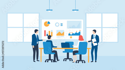 Business meeting with presentation of charts and graphs in a conference room with four people present