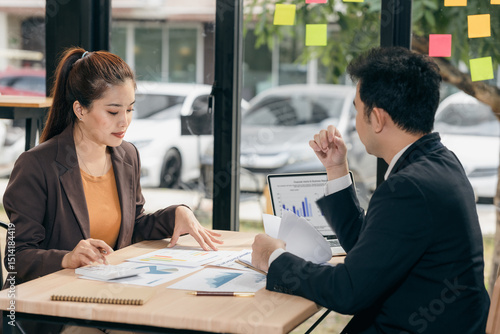 Business men and women discussing charts and graphs showing results of successful teamwork using laptops. Business strategy planning and brainstorming.