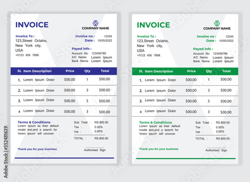 Business Minimal Corporate Invoice design template vector illustration bill form price . Creative template and stationery design payment agreement design template Cash Memo, Vector Quotation Design