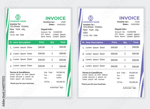 Business Minimal Corporate Invoice design template vector illustration bill form price . Creative template and stationery design payment agreement design template Cash Memo, Vector Quotation Design