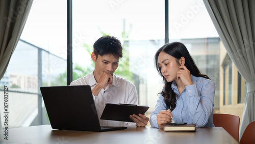 Business partners discussing strategy, working on laptop with notebooks and reports on desk.