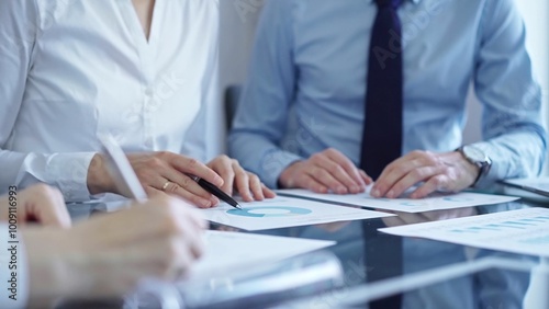 Business people are reviewing a financial results and discussing the terms of the agreement. Teamwork and planning