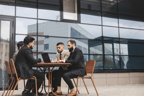 Business people colleagues sit at a table on the street and talk. Business team and brainstorming. Interaction and conversation at the meeting