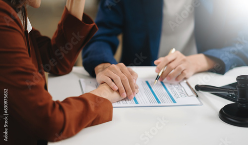 Business people compassionately holding hands and discussing contract papers with laptop and tabletat office room.
