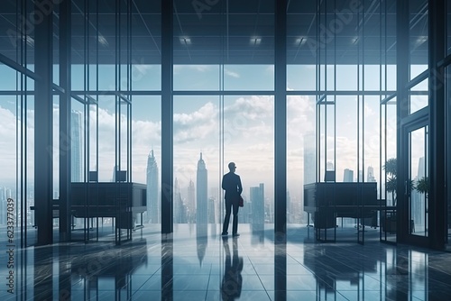 business people discussing business in the office view from outside the building