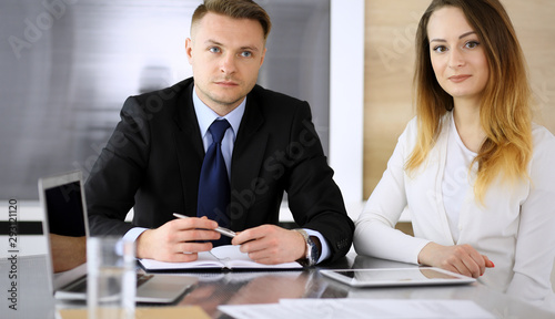 Business people or lawyers discussing questions at meeting in modern office. Unknown businessman and woman with colleague sitting and working at the glass desk. Teamwork and partnership concept
