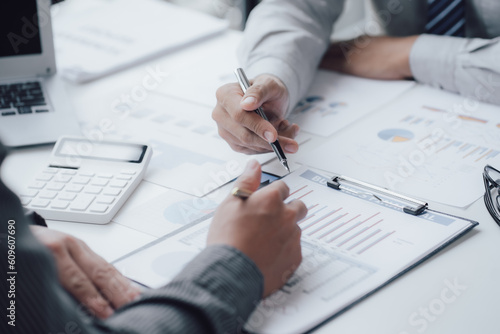 Business people talking about business strategy Collaborate teamwork during discussions on financial and marketing documents, financial data analysis meetings, and in-office charts.