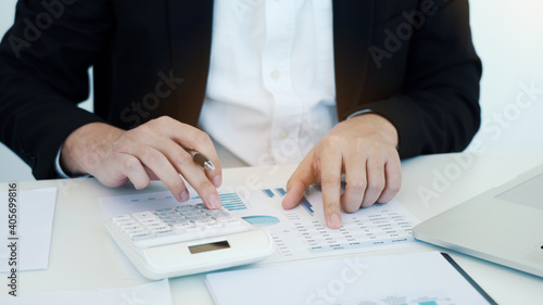 Business people working on desk and analysis about summary budget finance and using laptop making note report.
