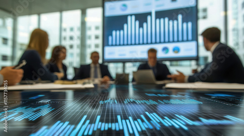 Business people working together in the office with financial data on the screen. Modern corporate teamwork analyzing market growth, strategy planning, and report discussion.