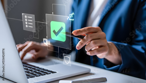 Business person approvals Documents By Technology, Business person using stylus on a digital interface by checklist and checkmark approval icon.