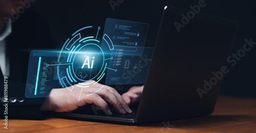 Business Person Creating AI Images, Realistic Photos, and Applications using Laptop and AI Chatbot System Technology, Smart Artificial Intelligence to Generate Computer Photographs.