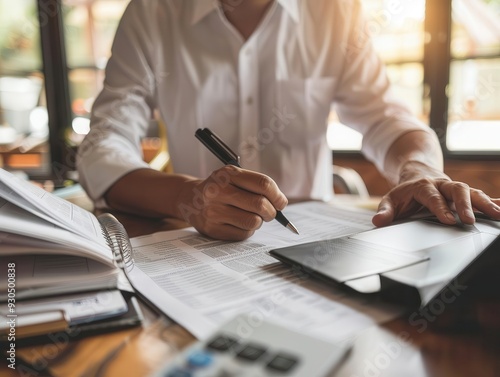 Business person in white shirt working on financial documents at desk, writing and double-checking information for accuracy.