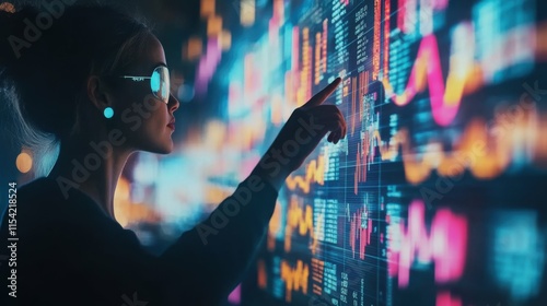 Business person pointing growing virtual hologram of statistics, graph and chart.Business strategy development and growing growth plan. Investment of growth on currency rate