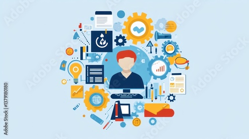 Business person surrounded by icons, illustrating teamwork and innovation. Use Stock photo for business, teamwork, and productivity concepts