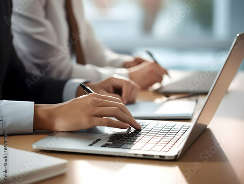 Business person using laptop and man or woman operating laptop and making a note, Business Office photo, Business Working environment, AI generated Photo
