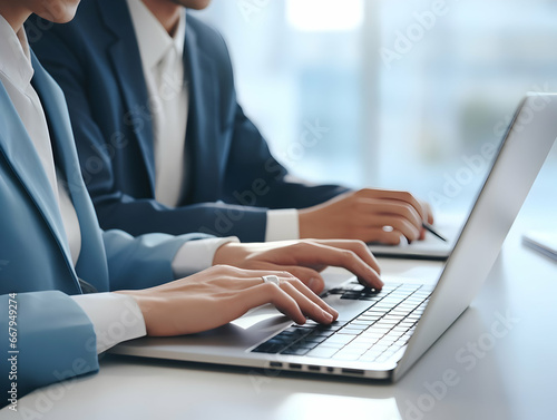 Business person using laptop and man or woman operating laptop and making a note, Business Office photo, Business Working environment, AI generated Photo