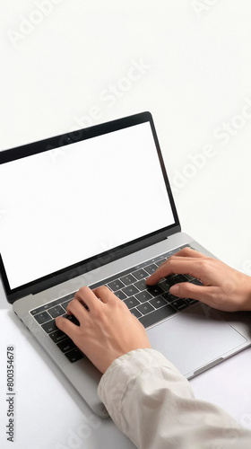 Business person working online or learning using laptop mock up blank white empty screen, hands typing on computer background close up view. Mockup display for ads. Close up view.