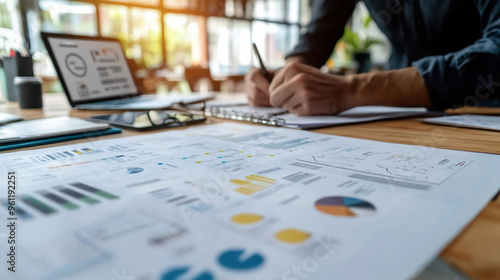 Business plan blueprint on wooden desk with coffee, showcasing charts and graphs. atmosphere is focused and productive.