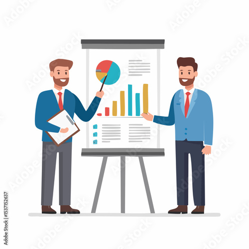 Business Presentation and Analysis: Two business professionals collaborating on a presentation, reviewing charts and graphs to analyze data and strategize for future business endeavors.
