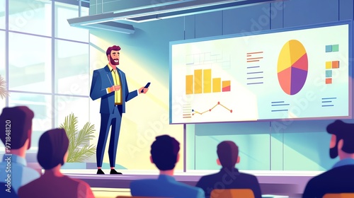 Business presentation with a professional speaker showing charts and graphs to an attentive audience in a modern office setting.