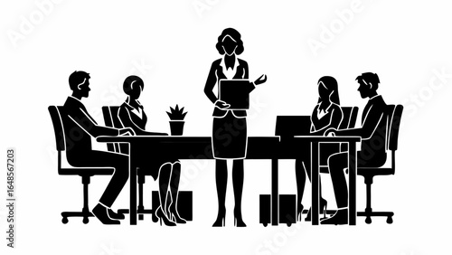 Business presentation with a woman standing and presenting to a group of people at a conference table | editable eps vectors