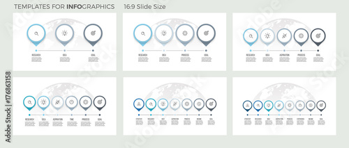 Business presentations. Timeline infographics with 3, 4, 5, 6, 7, 8 steps, options, arrows. Vector template.