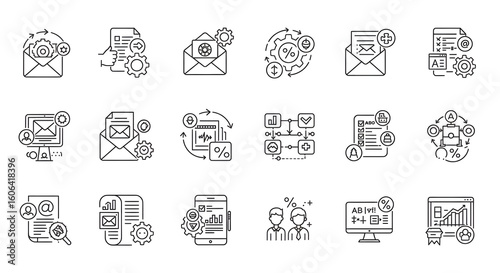 Business process automation and data analysis thin line icon set. Digital marketing and optimization symbols.