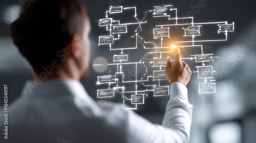 Business professional analyzes workflow using digital technology to enhance processes during a corporate meeting