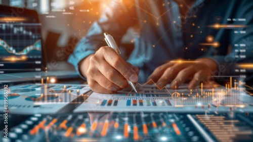 Business Professional Analyzing Financial Data and Graphs on Digital Tablet and Paper Reports in Modern Office