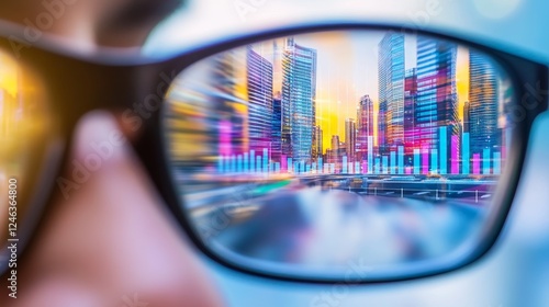 Business professional analyzing financial data reflected in glasses, with a city skyline at sunset