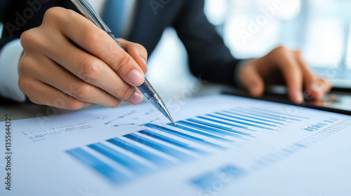 Business professional analyzing financial data with pen, focusing on chart with blue bars, showcasing growth and trends