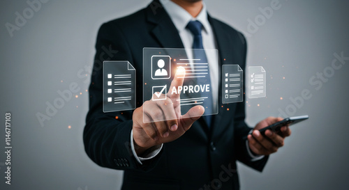 Business Professional Approving Digital Documents with Futuristic Interface Technology