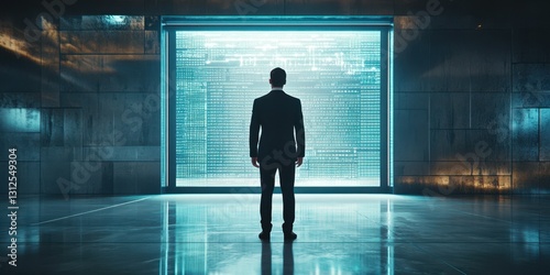 Business professional contemplating future in front of digital projection in modern office setting