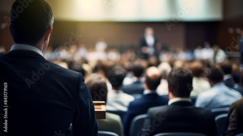 Business professional giving a presentation to a large audience in a conference hall. Focus on attentive listeners in a formal setting.